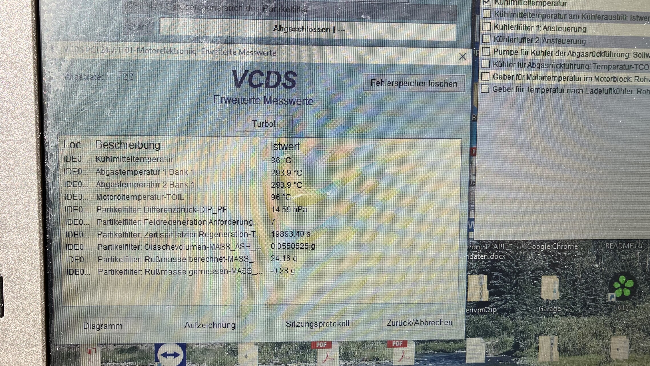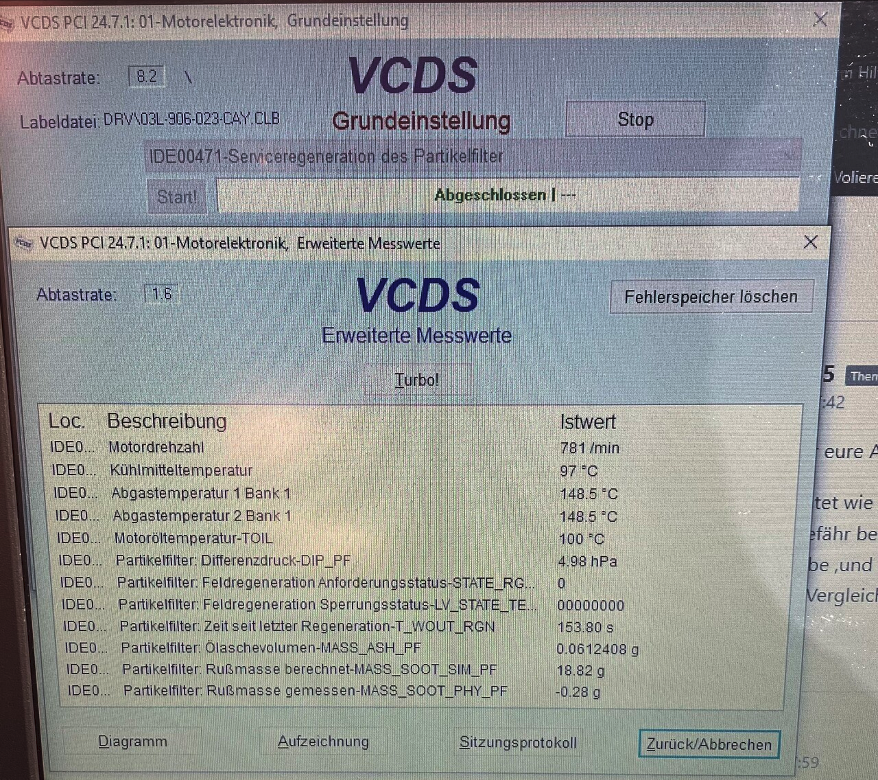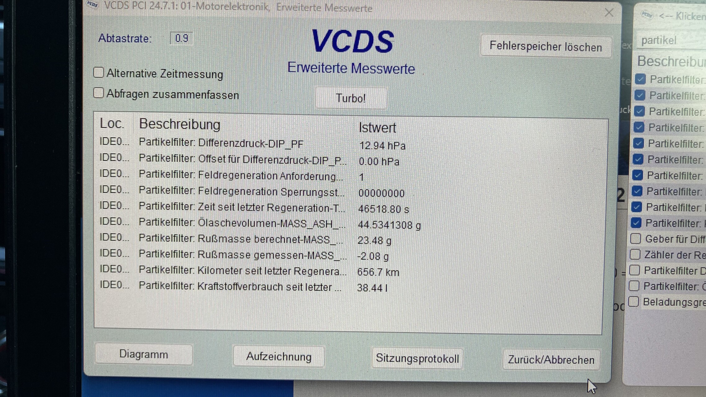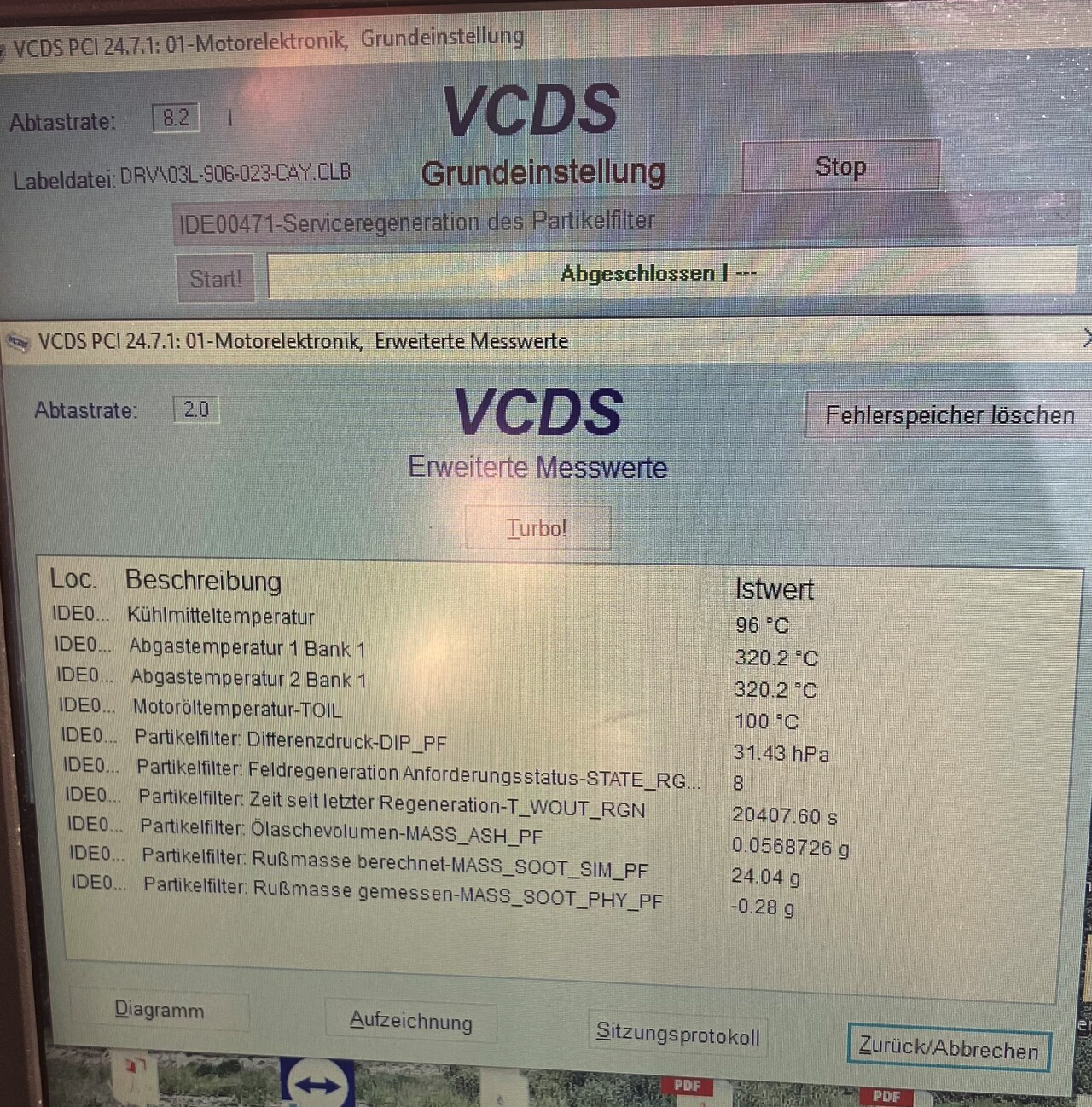 Nach dem Vorgang die folgenden Messwertblöcke kontrollieren. Die Beladung des Partikelfilter sollte nur sehr klein sein (entweder 0 % oder leicht drüber)