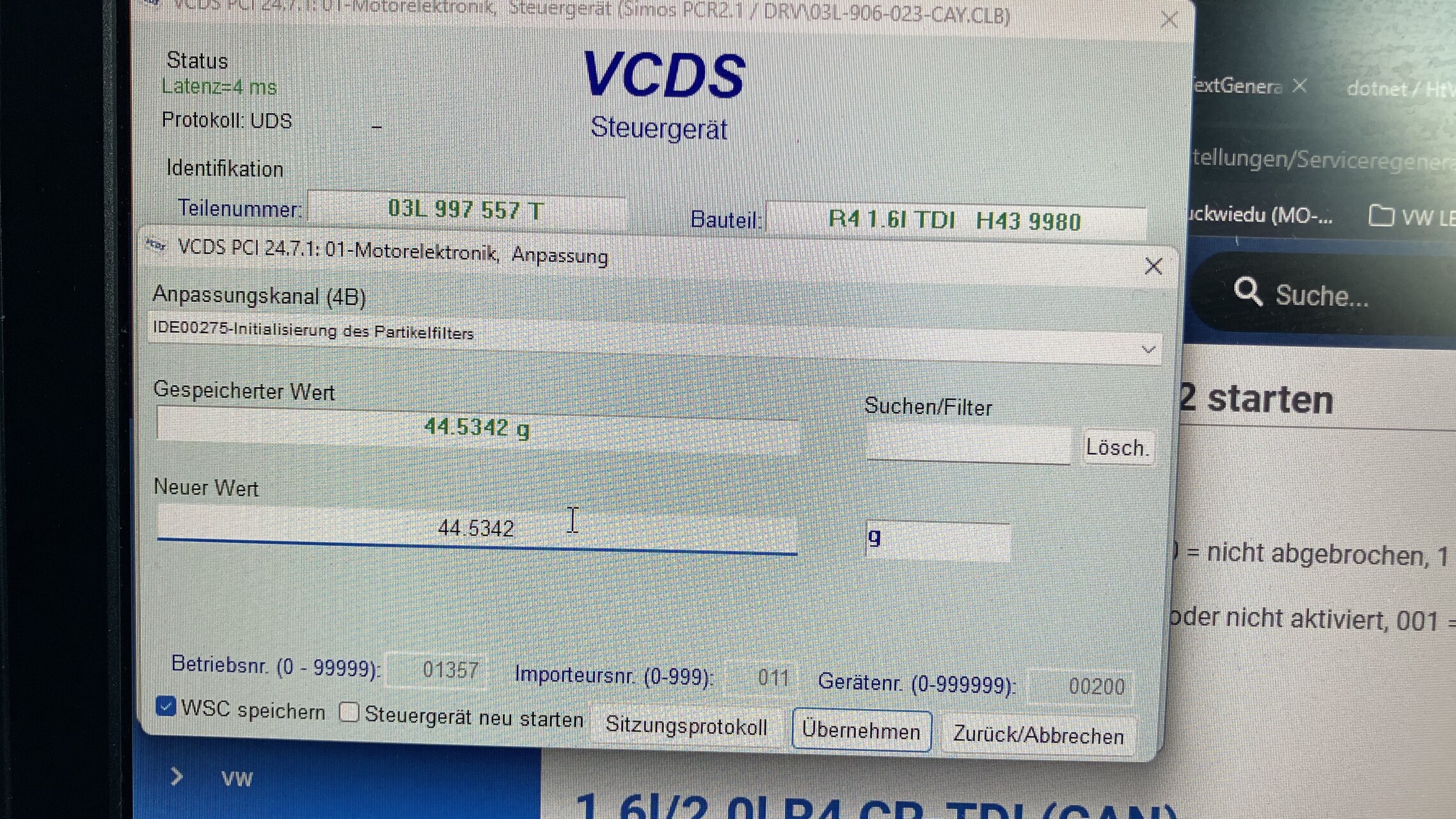 - Beladung Partikelfilter unter den Vorgaben (siehe MWB 108.2/3 -oder- 241.2/3 VCDS sollte hier die entsprechenden Werte anzeigen)