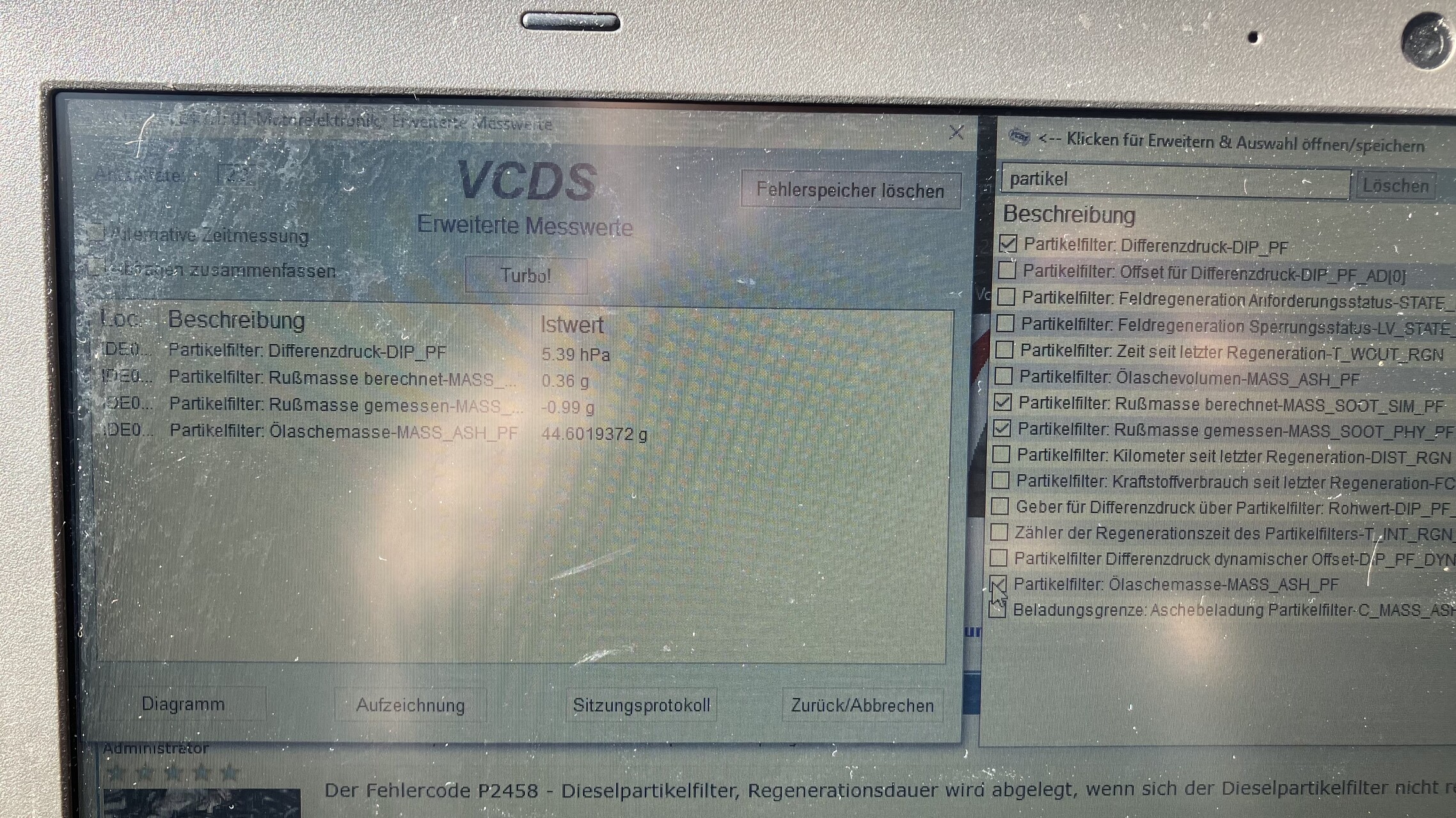 Der Fehler im Fehlerspeicher konnte nicht gelöscht werden, da durch die Ölaschemasse und dem Differenzdruck die Rußmasse erechnet wird.