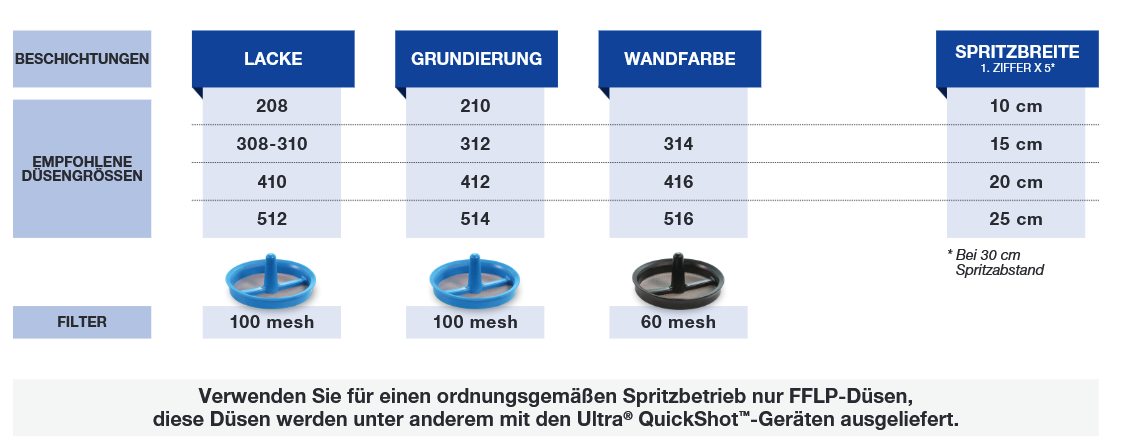 In der nachstehenden Tabelle finden Sie allgemeine Empfehlungen für Spritzdüsengrößen und