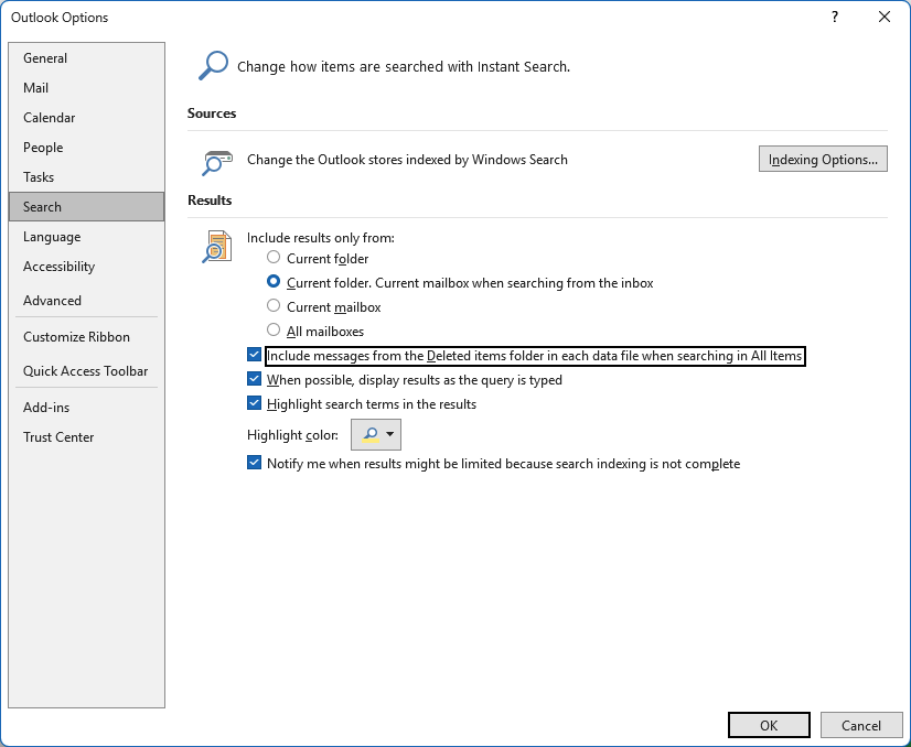 Optionen -> Suche - "Gelöschte Elemente bei Suche mit einbeziehen"